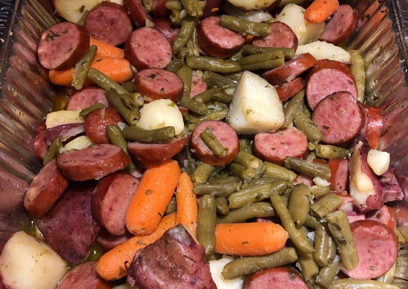 - Add drained red potatoes and baby carrots to baking pan with kielbasa and green beans